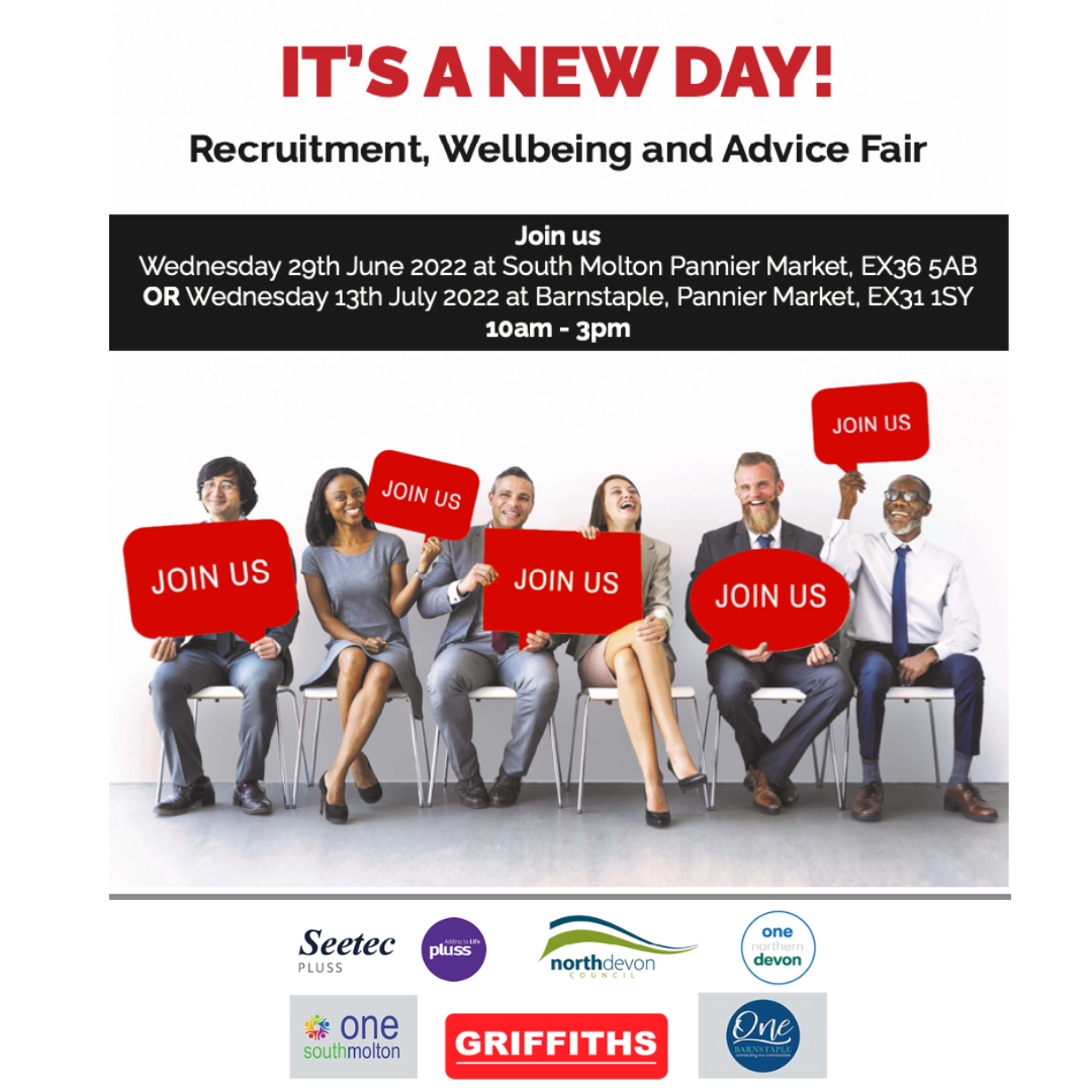Griffiths are proud to be working in partnership with Seetec Pluss, and One Northern Devon to host two Recruitment, Wellbeing and Advice Fairs. The events will be held in Barnstaple and South Molton to aid employment in these areas. Attendees are invited to come along to meet employers, apprenticeship providers and receive career and wellbeing advice!