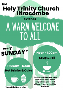 It is anticipated that this programme will continue to grow and more details published on what will be available at each specific venue or on a certain date so please check back here, keep an eye on our socials and the posters that will be visible at each one of the Ilfracombe Warm Space venues.