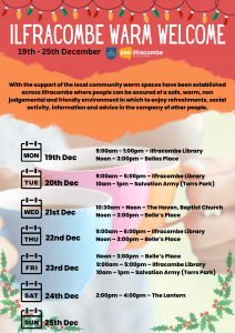 With the support of the local community warm spaces have been established across Ilfracombe where people can be assured of a safe, warm, non judgemental and friendly environment in which to enjoy refreshments, social activity, information and advice in the company of other people.